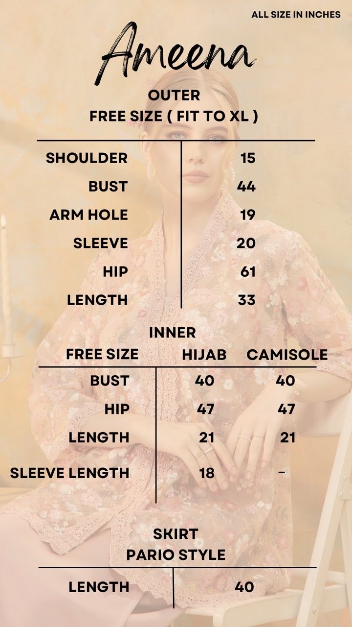 The perfect combination of modern and traditional. Ameena will glow up your day with ellegant design and cutting. It's beautifully seen in flower embroidery