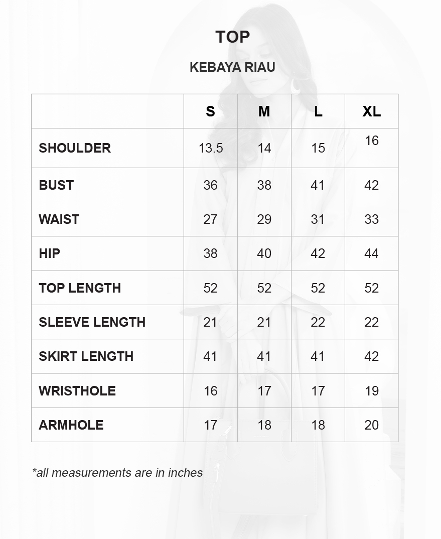 IMPORTANT NOTE: All measurements are the same as the Kebaya Hana with the exception of length which is 52 inches instead of 55